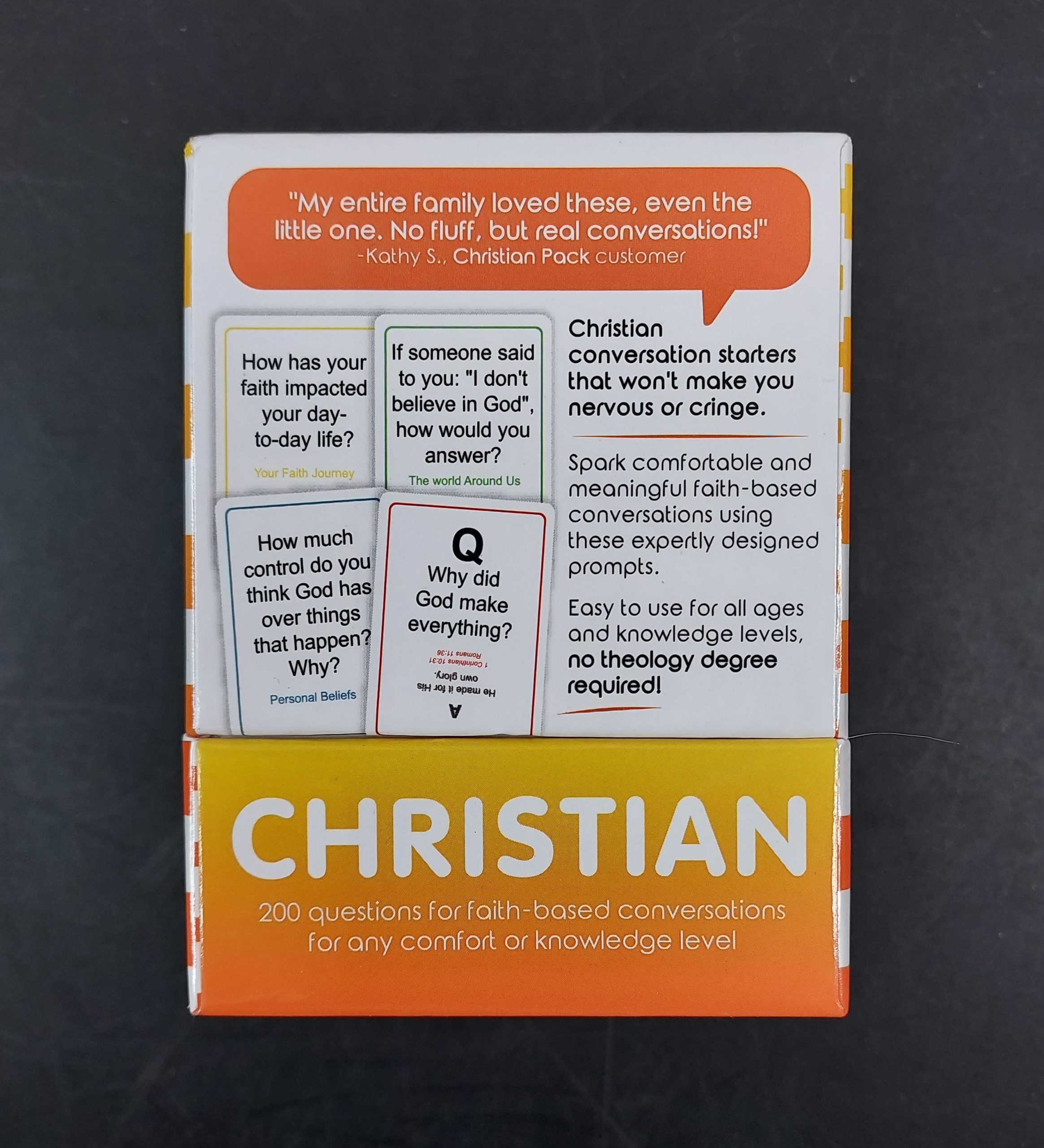 Spark meaningful conversations and deepen your faith connections with the Talking Point Cards – Christian Edition. Thoughtfully designed to inspire reflection, fellowship, and spiritual growth, this card set is perfect for family gatherings, small groups, youth ministries, or personal devotion time. Each card features engaging, faith-centered prompts rooted in Christian values—encouraging discussions about scripture, life experiences, gratitude, prayer, and living out your beliefs in everyday life. Whether you're breaking the ice in a group setting or seeking deeper one-on-one conversations, these cards make it easy to connect on a more meaningful level. Beautifully crafted and easy to use, this set is ideal for all ages and stages of faith. It also makes a thoughtful gift for church members, friends, or loved ones looking to strengthen their spiritual journey.